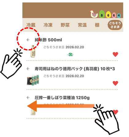 - 戻したい食材の横にある「←(左矢印)」ボタンをタップしてください。