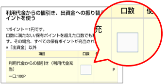 例えば、470ポイントのうち400ポイントを申し込む場合、100口の欄に「4」と記入してください。470ポイントすべて申し込む場合は、500口の欄に「1」と記入ください。