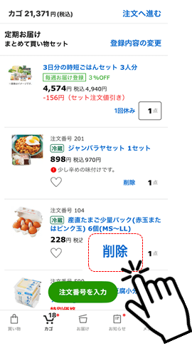 『まとめて買い物セット』内の商品は、「買い物カゴ」画面で削除が可能です。