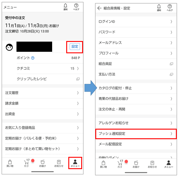 【パルシステムアプリ】注文の締切などをプッシュ通知でお知らせしてほしいです2025年11月12日 更新メニュー>設定>プッシュ通知設定より配信設定ができます。 ご使用の端末側の通知設定がOFFになっている場合、通知が配信されません。 端末の設定>アプリ>パルシステムアプリ>通知から通知を許可してください。