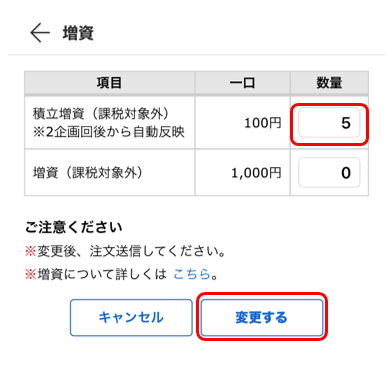 ※増資の変更・停止は申し込み(変更後)、同じ数字を2週連続で設定すると、3週目以降は自動でその数字となります。
